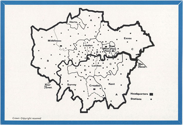Diagram of Greater London showing constituent Brigades of the enlarged London Fire Brigade, 1965. The meaning of the key letters is unknown but they may designate operational divisions.