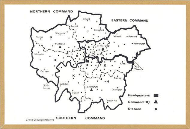 Diagram of London Fire Brigade area, 1966. The key letters indicate the Divisions within each of the three Command areas: Northern, Eastern, and Southern, as they were in 1966.