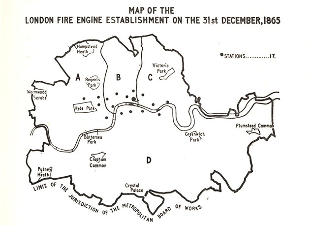 Disposition of the London Fire Engine Establishment as on 31st December 1865. The key letters indicate the four operational districts.
