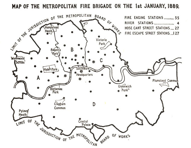 Disposition of the Metropolitan Fire Brigade as on 1st January 1889. The key letters indicate the four operational districts.