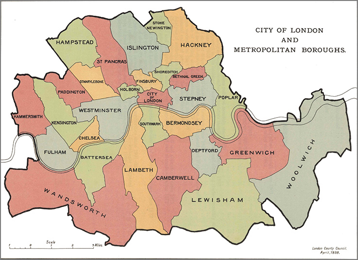 The assumption of overall control by the London County Council in 1889 did not affect the vestries and district boards which carried on much as before for another ten years. There were some adjustments from time to time, two district boards of works being dissolved and one renamed, so that at the end there were twenty-nine administrative vestries and twelve district boards of works. Steadily, though, public opinion was turning against the system of vestry rule with its unsatisfactory electoral and voting arrangements. The London Government Act 1899 (effective 1900) replaced the vestries, district boards and the extra-parochial bodies with twenty-eight Metropolitan Boroughs with a much wider electorate than previously. The only boundary changes were minor so that in most instances the boroughs followed the lines of their predecessors, though there were some mergers of the smaller parishes. The new boroughs were given the same powers of promoting and opposing bills in parliament as the county boroughs, so that in this they were no different from many of the most important cities in the country, such as Birmingham or Newcastle upon Tyne. |