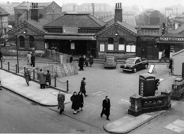 Enfield Town in about 1957 just before the existing 1872 station building was demolished. The present location of the LNER property plate [ENF106] is just out of shot, right.