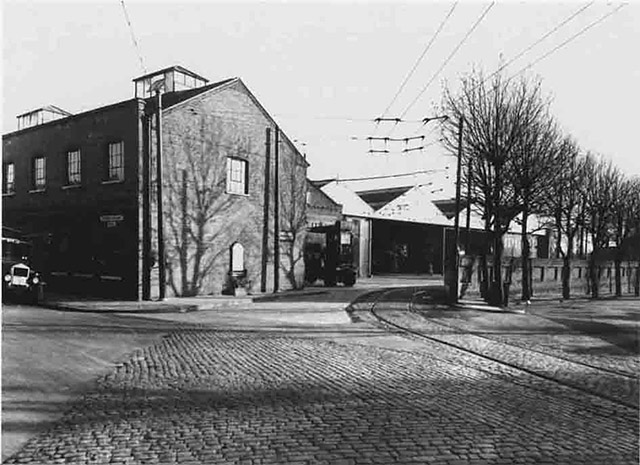 Finchley depot in 1936. The war memorial can bee seen on the building in the foreground.