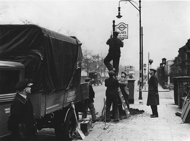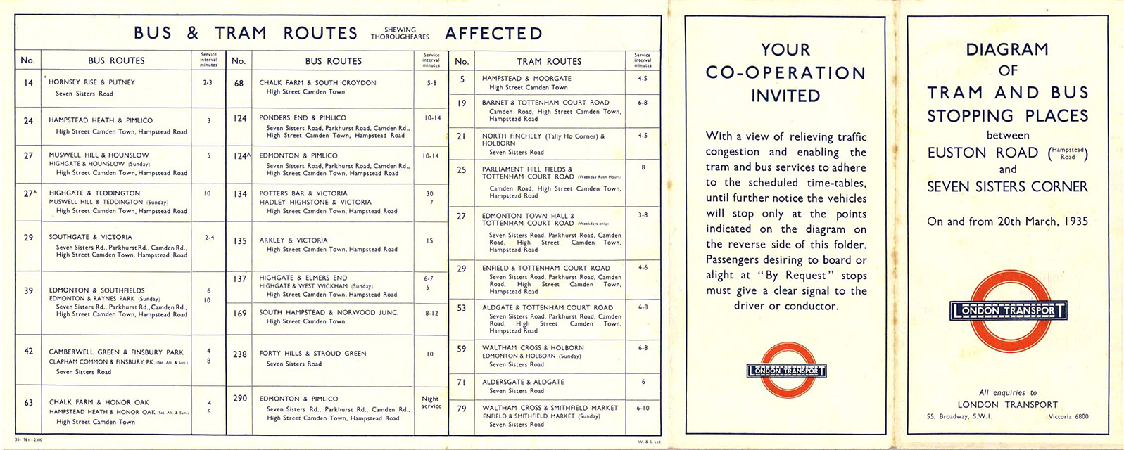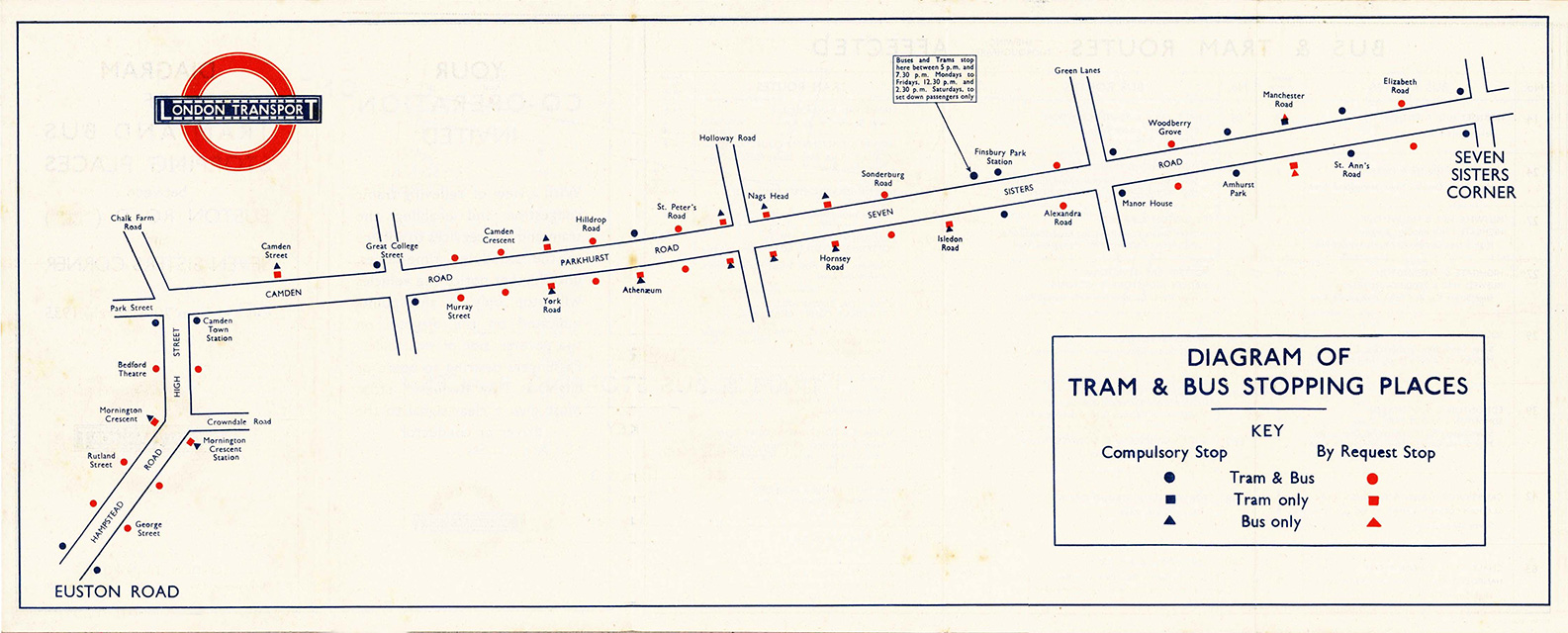 Trams and trolleybuses, being ‘light railways’, have always been required to have designated stops for passengers but horse buses could be hailed anywhere along the route and halted for alighting at any convenient point. In London this practice was continued after the motor bus was introduced, though by the 1920s certain recognised stopping points in central London were formalized by bus stop signs. This may have resulted from First World War traffic pressures. Outside the central area the first experimental ‘fixed stop scheme’ for buses was introduced in March 1935 between Euston Road (Hampstead Road) and Seven Sisters Corner, South Tottenham. This was successful and fixed stops, both ‘compulsory’ and ‘request’, very quickly spread across the whole network.
