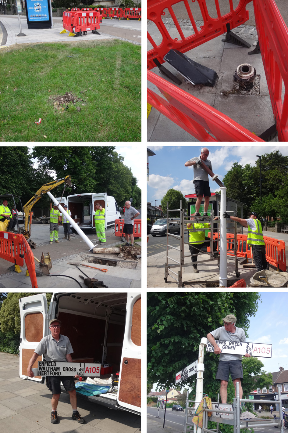 (Top left) A day or two after the incident at Easter 2021 the speeding car’s tyre tracks were still visible on the grass. (Top right) All that remained of the local direction sign after the car had demolished it. (Middle left) On 15th June 2021 David Gosling (on the right) watches as the post for the new sign at Park Avenue EN1 is lifted into place. (Middle right) He then inserts the fitting which holds the collars for the direction‘fingers’. (Bottom left) At the junction of Village Road with Ridge Avenue, David lifts out the new ‘finger’ for the other sign. (Bottom right) Having fitted it he then re-assembles the rest of the signpost. |