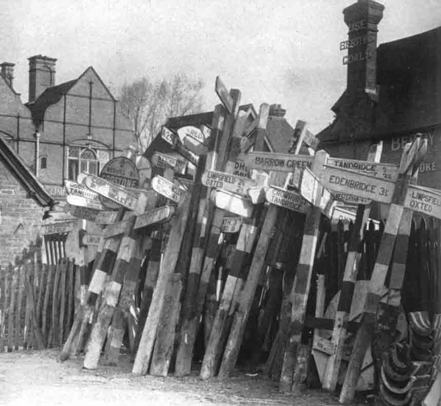Uprooted direction signs stored somewhere in Kent or Surrey in 1940.