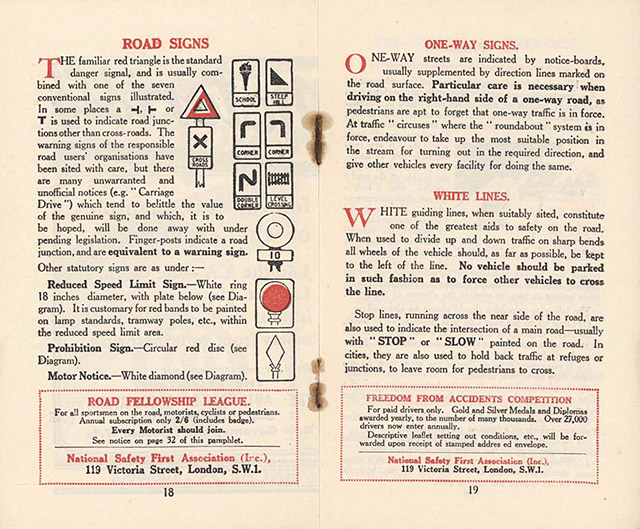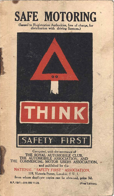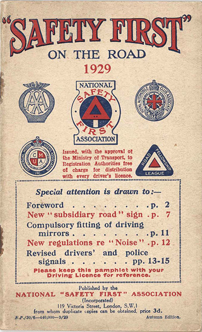 During the 1920s the number of vehicles on British roads continued to increase and without a statutory requirement for demonstrating a satisfactory standard of competence to drive, road conditions became increasingly hazardous with many fatal crashes. A private initiative in 1923 was the founding of the National ‘Safety First’ Association which issued booklets containing a large number of hints and tips on safer driving. (In 1941 the Association was renamed the Royal Society for the Prevention of Accidents.) |