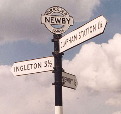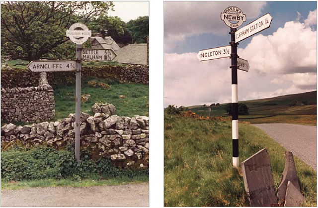 Two examples of pre Worboys fingerposts photographed in June 1989 in what was the West Riding of Yorkshire. These show the National Grid reference incorporated in the circular finial. To the left is at Malham Moor, and to the right at Newby. [courtesy of John Liffen]